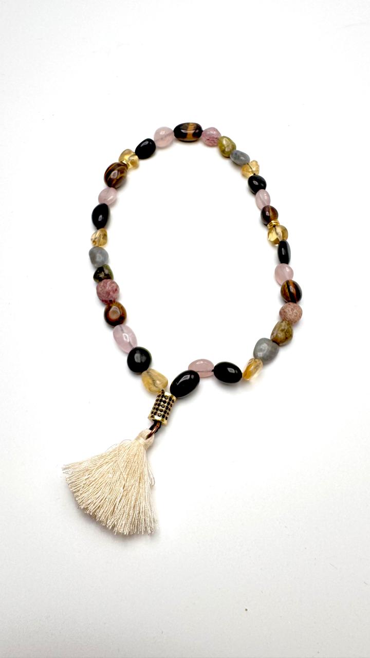 Un chapelet puissant qui combine la joie de la Citrine, l’amour du Quartz Strawberry et du Quartz rose, le courage de l’Œil de Tigre et la protection de l’Obsidienne. Idéal pour l’abondance, l’amour et la sécurité.