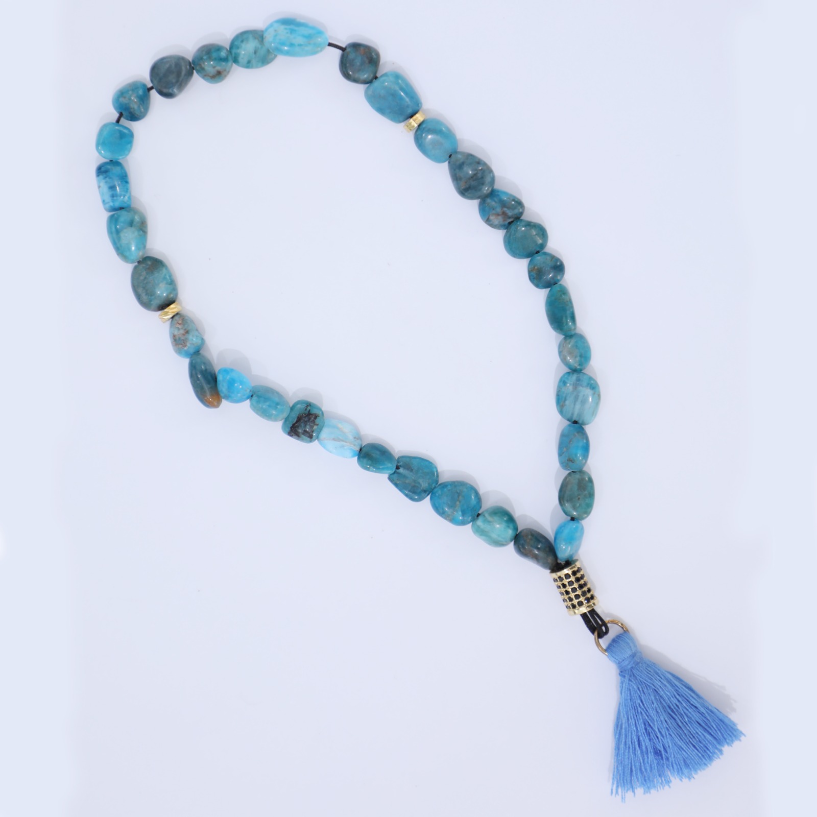 Ce chapelet est entièrement composé de perles d’Apatite, une pierre aux nuances de bleu profond, de vert émeraude ou de jaune. Reconnue comme une pierre d’inspiration et de motivation, l’Apatite stimule la créativité, la clarté mentale et l’expression de soi. Elle aide à dissiper la confusion et à renforcer la confiance, vous permettant de poursuivre vos objectifs avec détermination. C’est un allié idéal pour la méditation, pour ceux qui cherchent à s’épanouir sur le plan personnel et professionnel, ou pour cultiver une attitude plus positive.