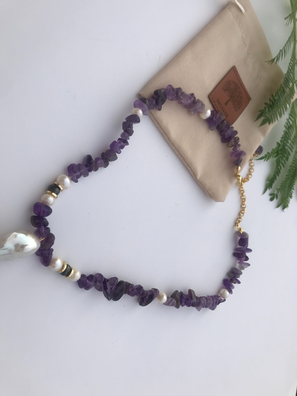 Ce collier unique marie la profonde sérénité de l’Améthyste à l’élégance intemporelle des perles blanches et noires. Les nuances apaisantes du violet de l’Améthyste, pierre de la sagesse et de la paix, sont sublimées par le contraste raffiné des perles claires et sombres, créant un bijou à la fois chic et équilibré. Porté près du cœur ou de la gorge, ce collier est un talisman qui apaise l’esprit, stimule l’intuition et apporte une touche de sophistication à votre tenue. Idéal pour ceux qui recherchent l’harmonie intérieure avec une esthétique audacieuse et classique.